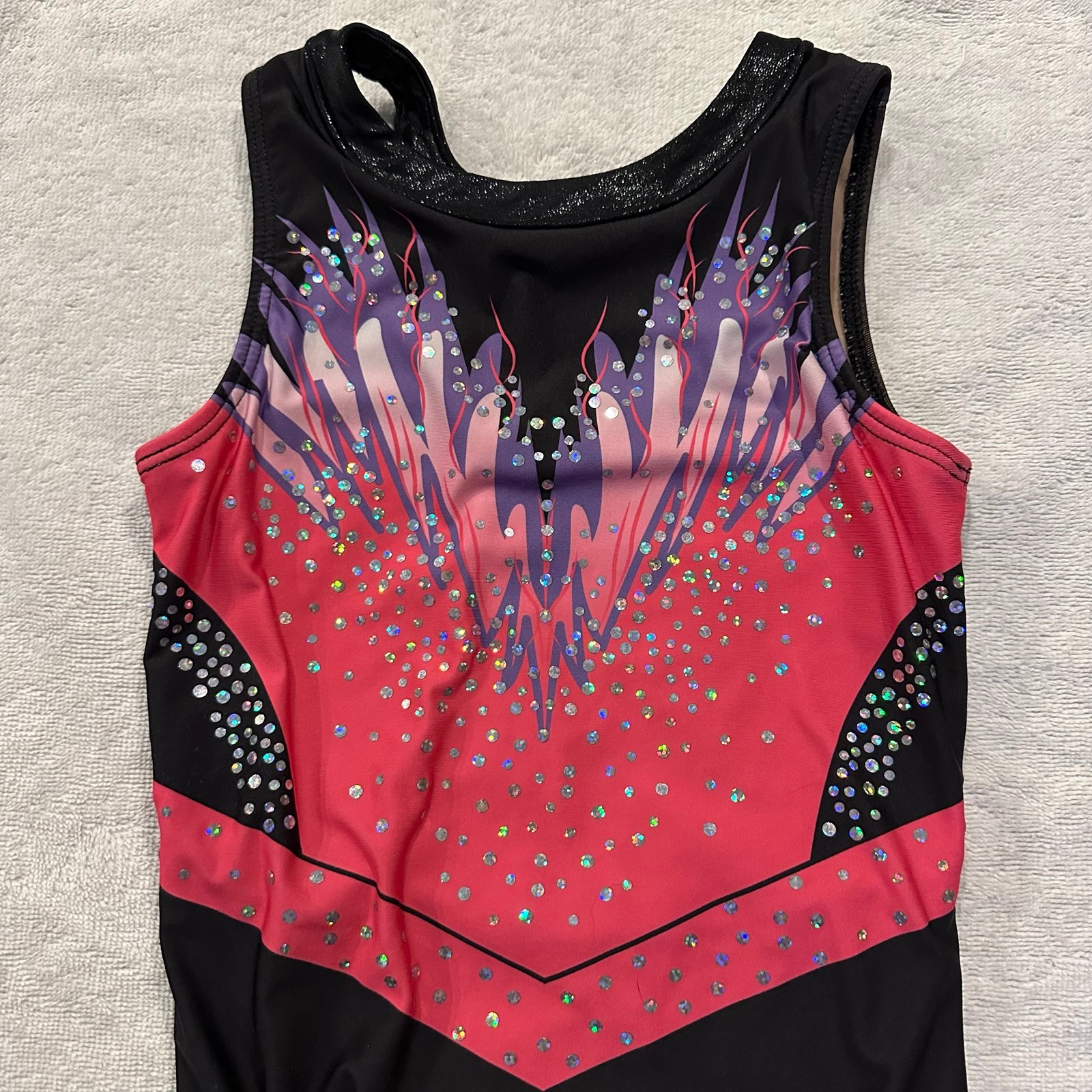Ozone gymnastics leotard. This leotard features a high neck, sparkles and strap detailing in the back. It is fully lined. There is a small area of faint discoloration in the back, see photo. It is otherwise in good, gently used condition. It is a size youth large, see size chart for measurements. It will be shipped from my smoke free, dog friendly home.
